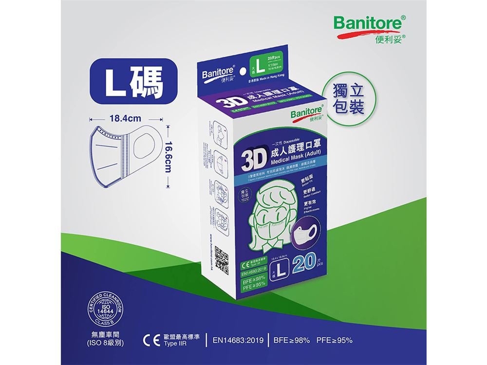 — 獨立包裝 — 已達歐盟EN14683:2019+AC:2019 Type IIR — PFE ≧ 95 % — BFE ≧ 98 % — (高)16.6cmx(闊)18.4cm (不包含耳帶) — 20個/盒 — 75盒/箱