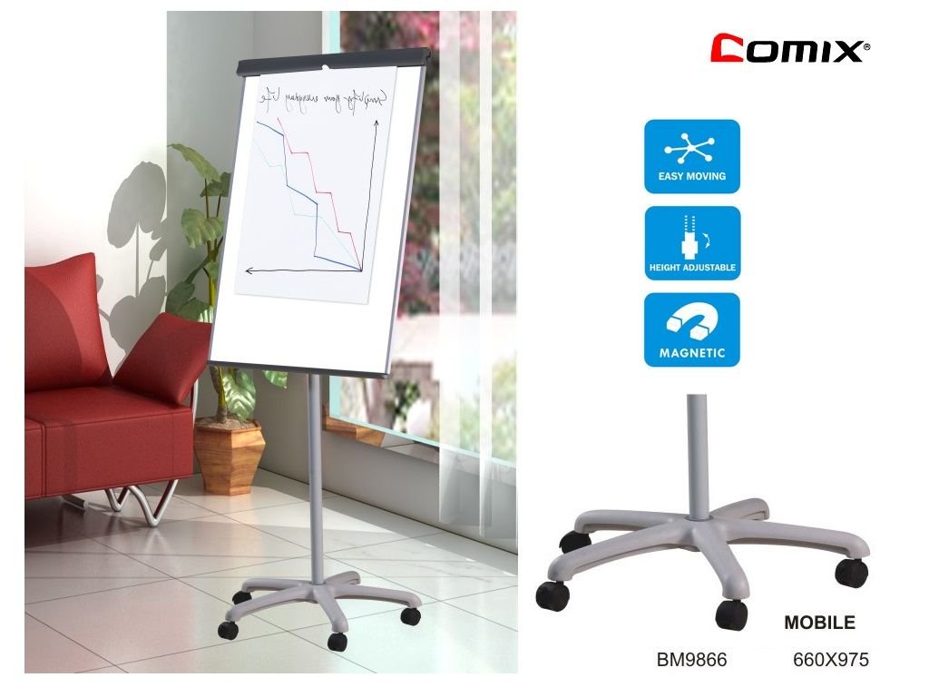 — 五輪可鎖式設計, 方便移動 — 可調校高度 — 磁性的白板表層,書寫及清潔流暢 — 附扣鉤方便掛上紙張 — 板面尺寸 : 660 x 975mm